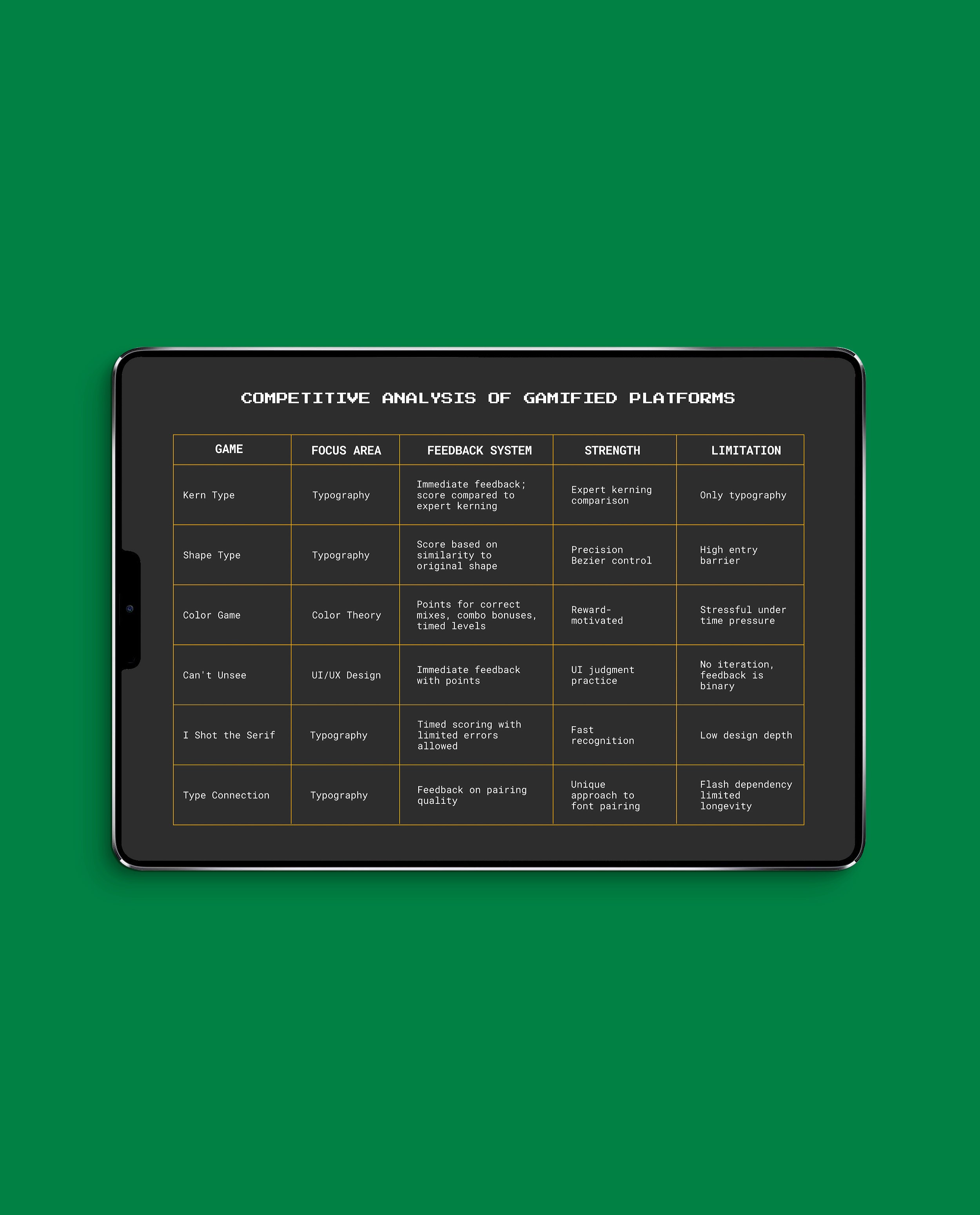 I began with a competitive analysis of gamified learning platforms, looking at how they engage users and where they fall short. Key insight: most platforms either oversimplify principles or overload learners, leaving little space for playful exploration.