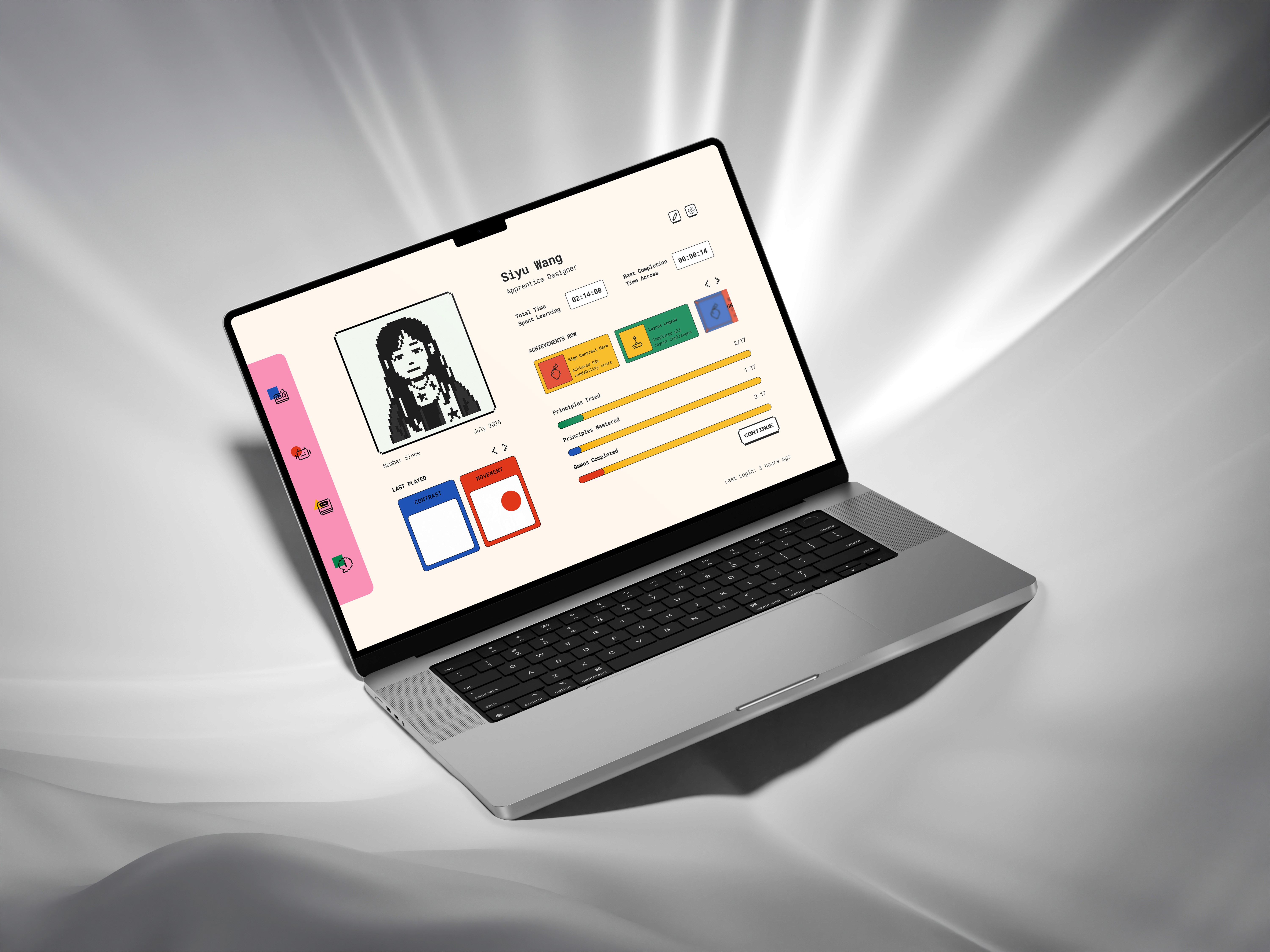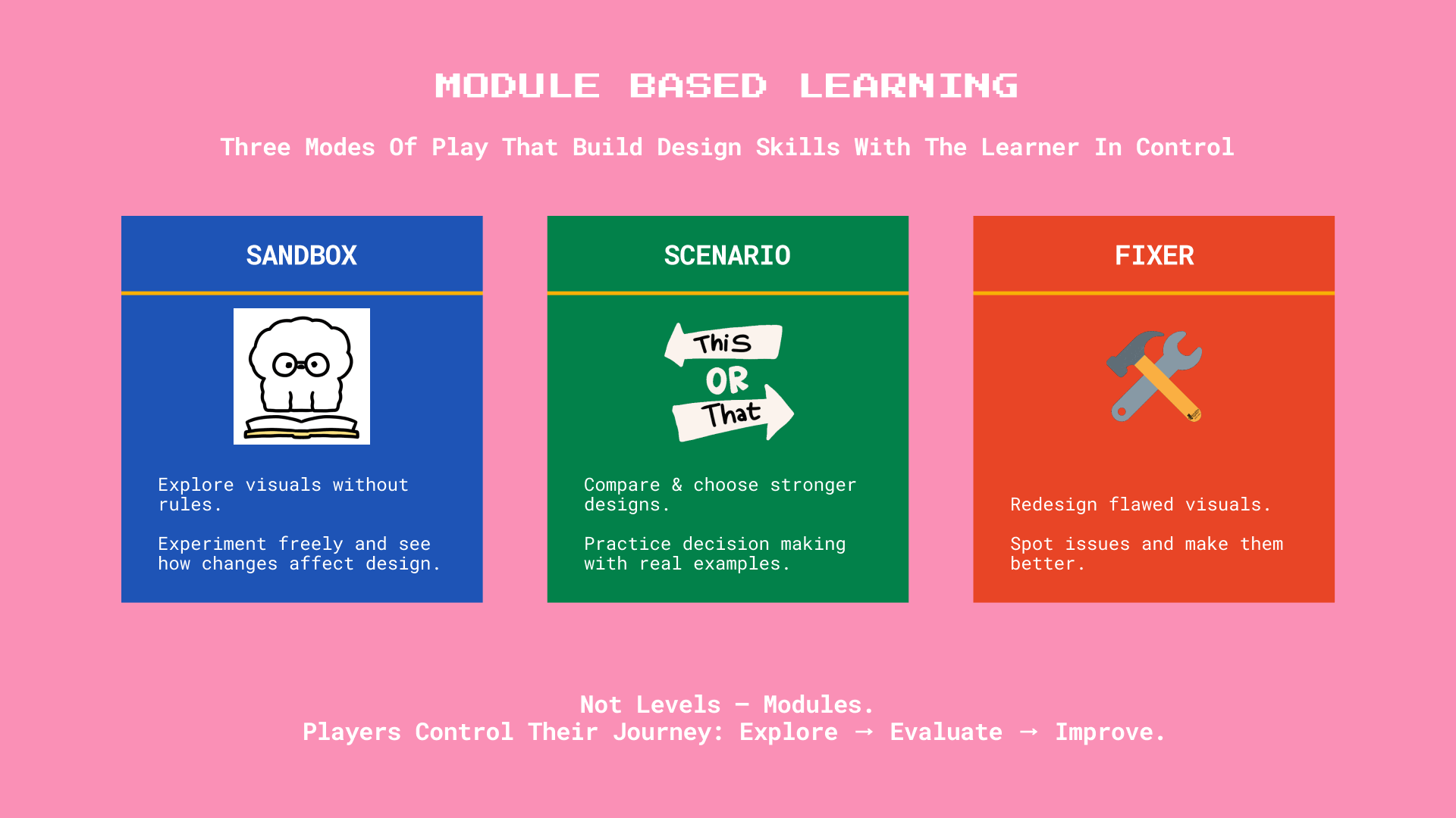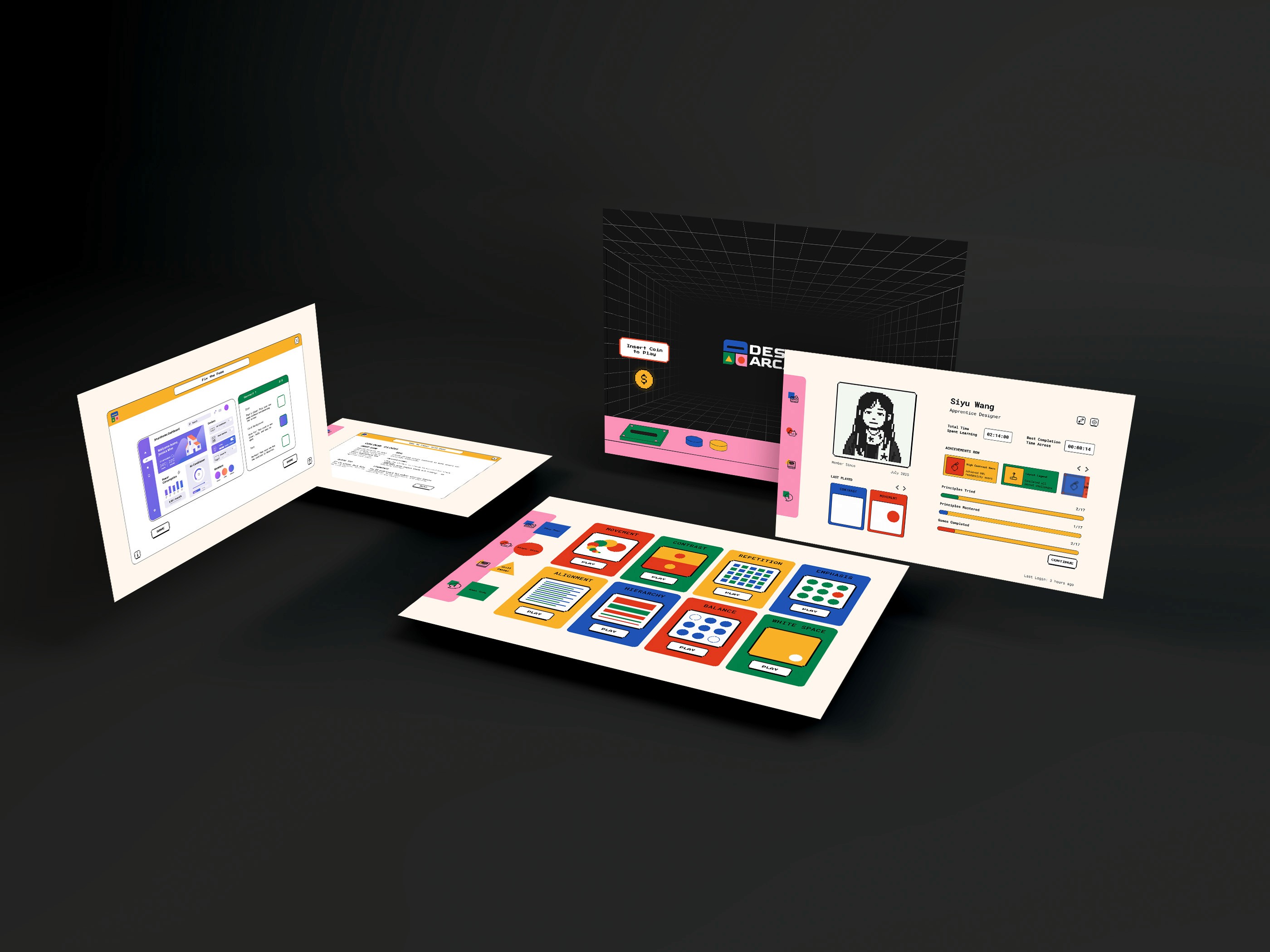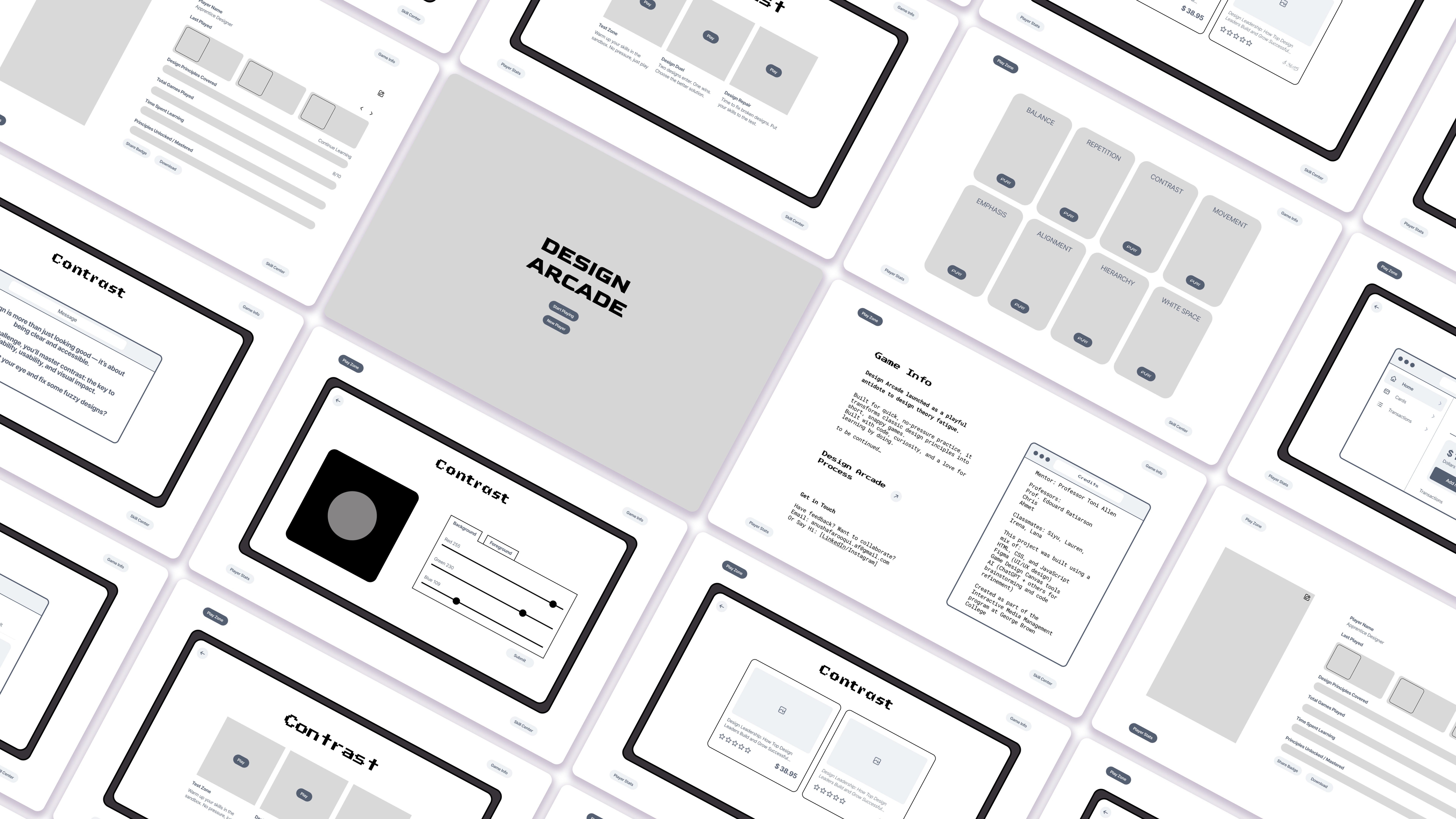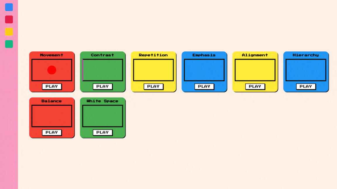 The MVP delivers three distinct gameplay modes that scale in complexity, showing how design principles can be practiced through doing rather than reading. The coded Test Zone validated the idea, making it clear, fun, and effective for learners. Designing for education taught me how to balance simplicity in gameplay with depth in learning outcomes, and how even small interactions can spark meaningful design practice.