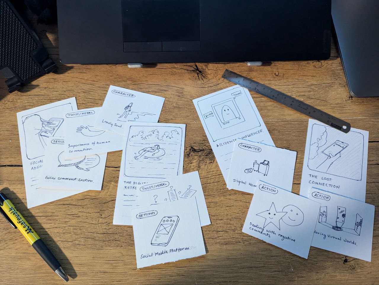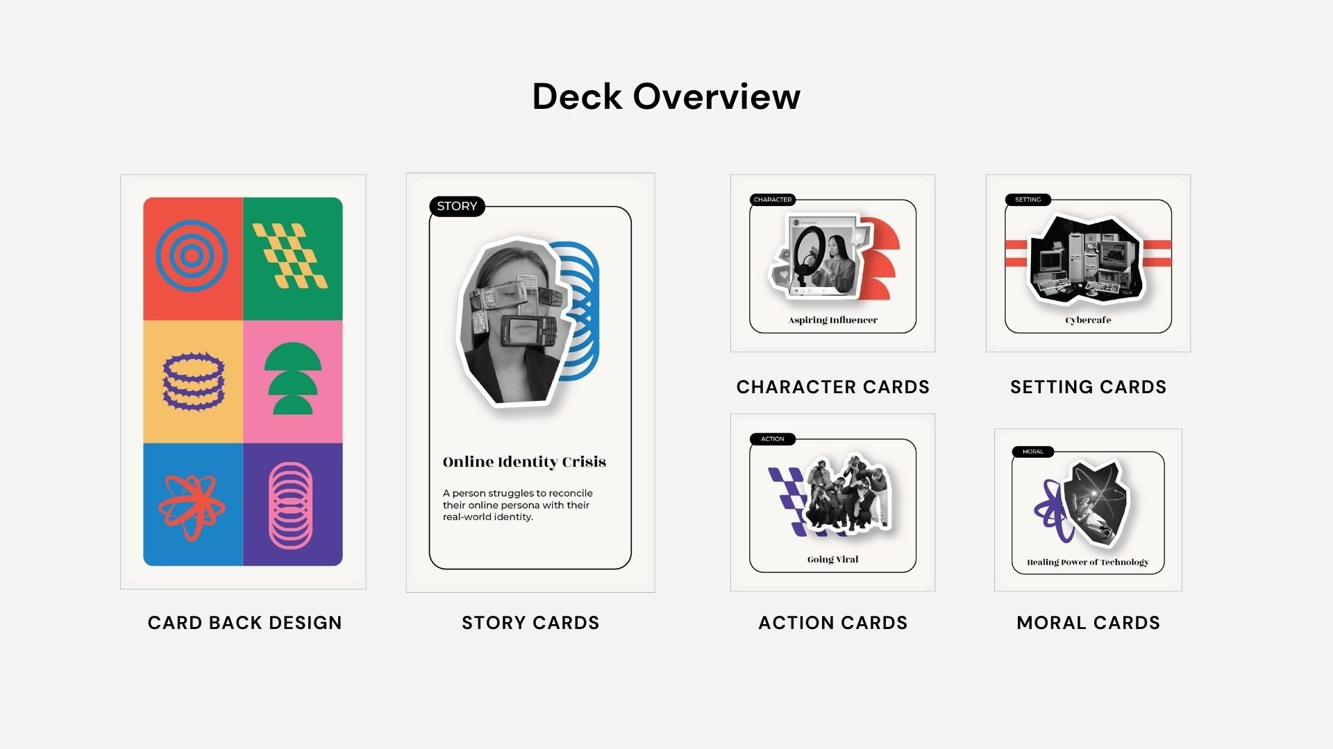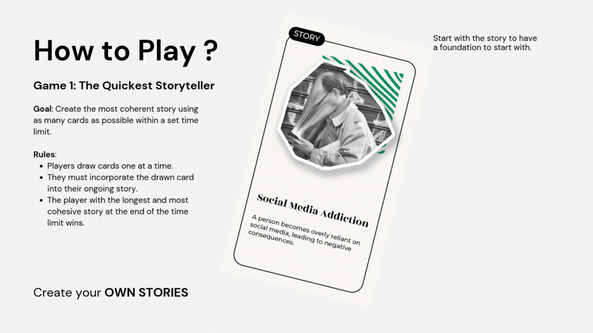 The result was a complete storytelling card deck with multiple tested gameplay modes: Quickest Storyteller, Most Insightful Story, and Creative Collaborator. The project blends nostalgia and contemporary digital themes, creating an adaptable game for solo play, group storytelling, or classroom use. It proved how simple mechanics can spark meaningful conversations around identity and technology.