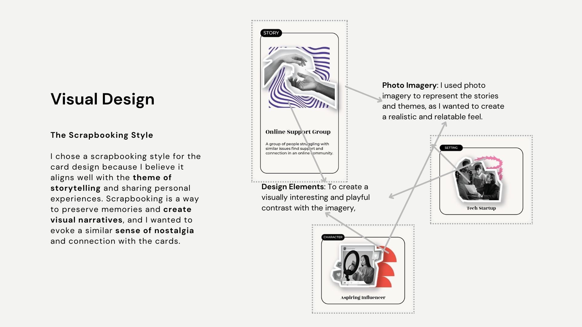 Built low-fidelity prototypes, tested with peers to refine gameplay, and designed a cohesive scrapbooking-inspired visual system with five card types (Story, Character, Action, Moral, Setting).