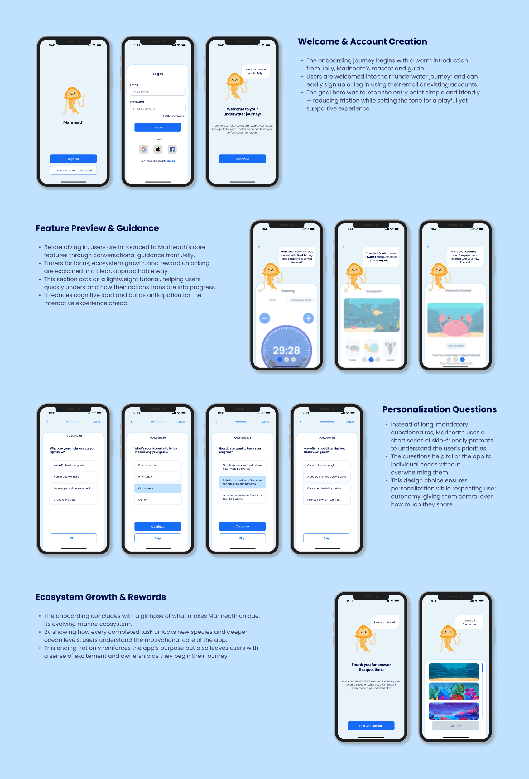 Marineath presents a fresh approach to productivity apps: one that shifts the focus from pressure to progress. The final prototype balances habit tracking, gamification, and personalization, all wrapped in a calming marine aesthetic. By tying personal growth to a visible, evolving ecosystem, the app reframes productivity as nurturing something alive rather than ticking off to-dos.