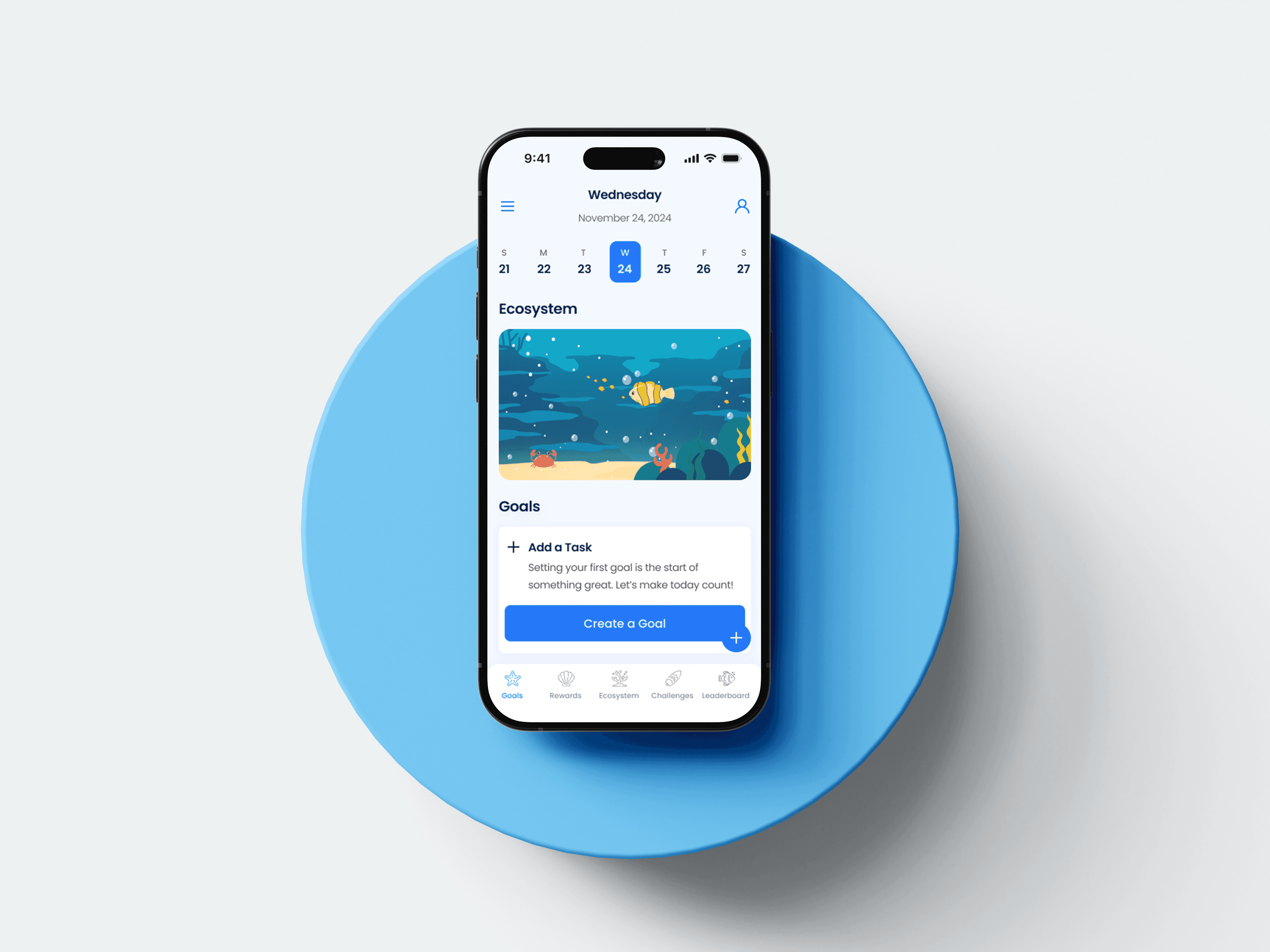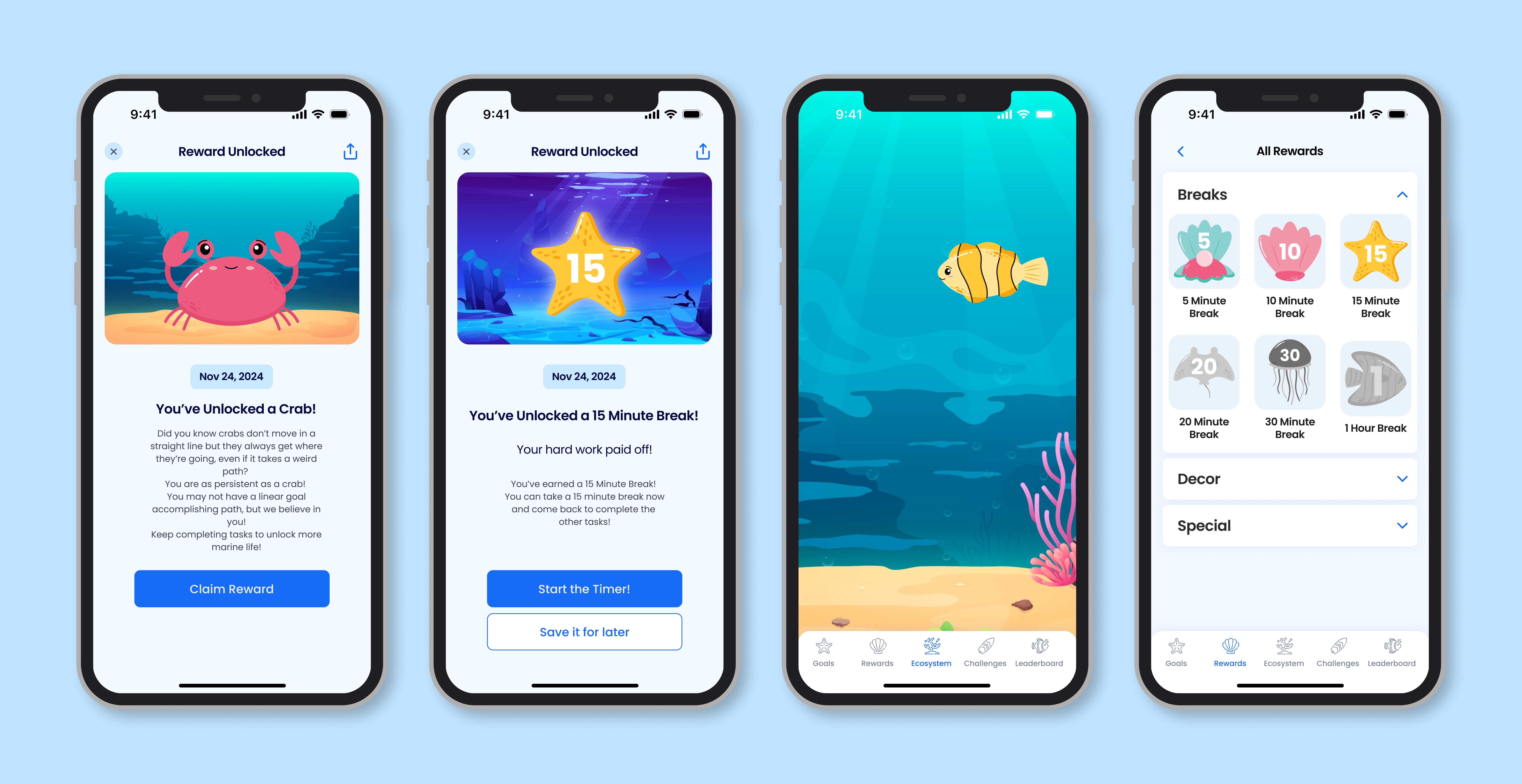 Meaningful Motivation: Completing goals unlocks marine creatures and well-being rewards, turning productivity into an engaging and rewarding experience.