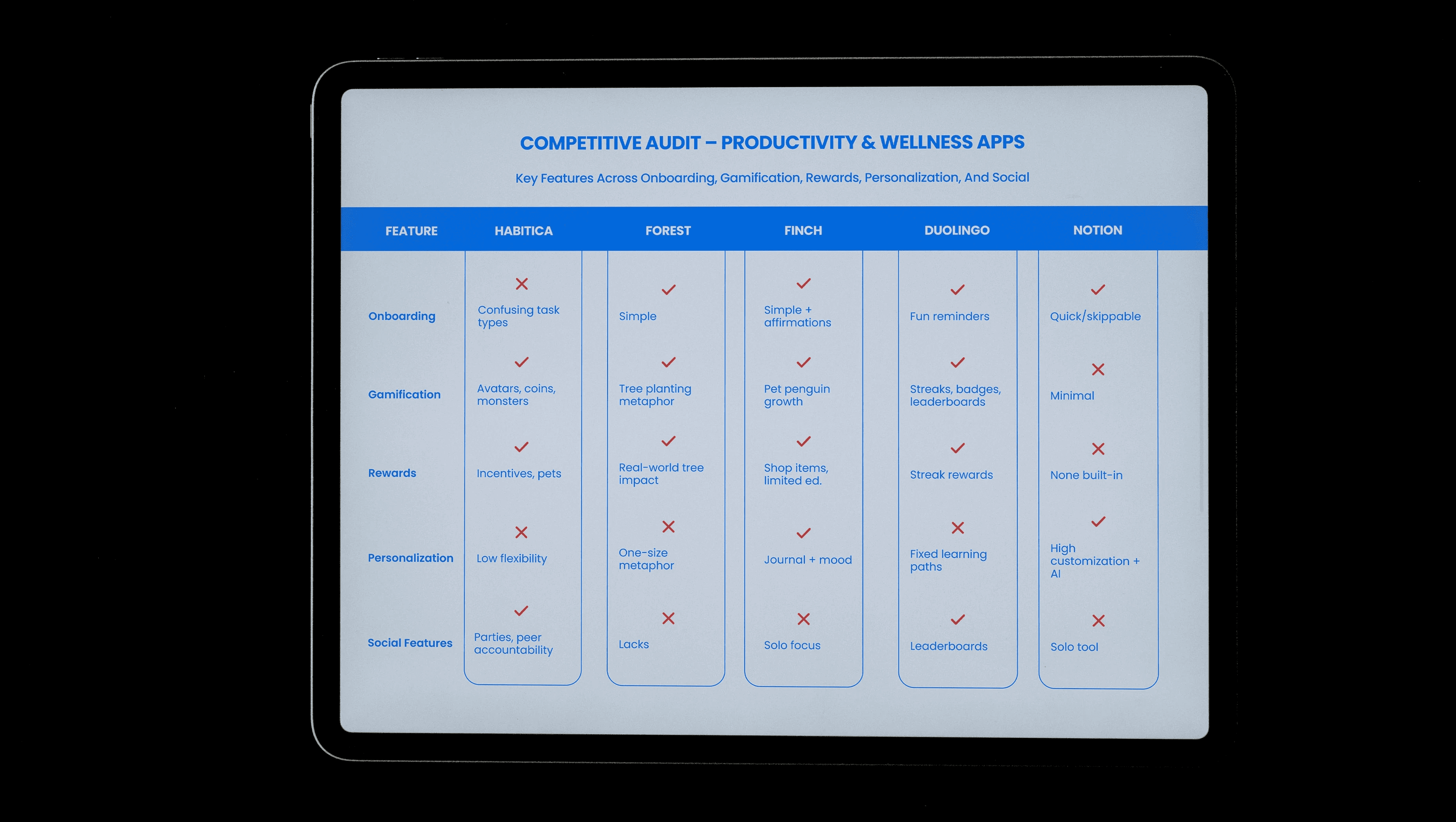 Conducted competitive analysis of apps like Habitica, Finch, Forest, and Productive to identify gaps in engagement, usability, and personalization.