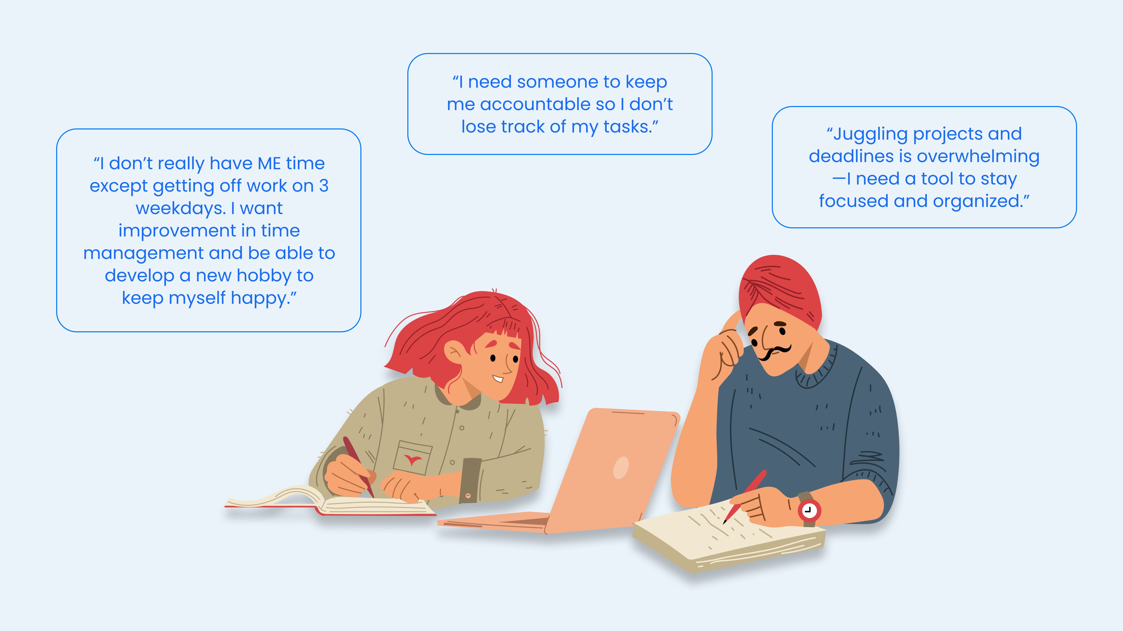 Mapped journeys and frustrations: procrastination, poor time estimation, lack of structure, and burnout.