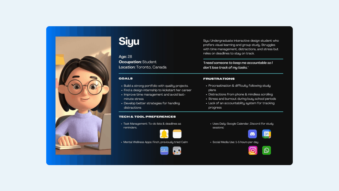 Built personas (Siyu the student, Alex the freelancer, Rosie the young professional) to anchor user needs in real contexts.